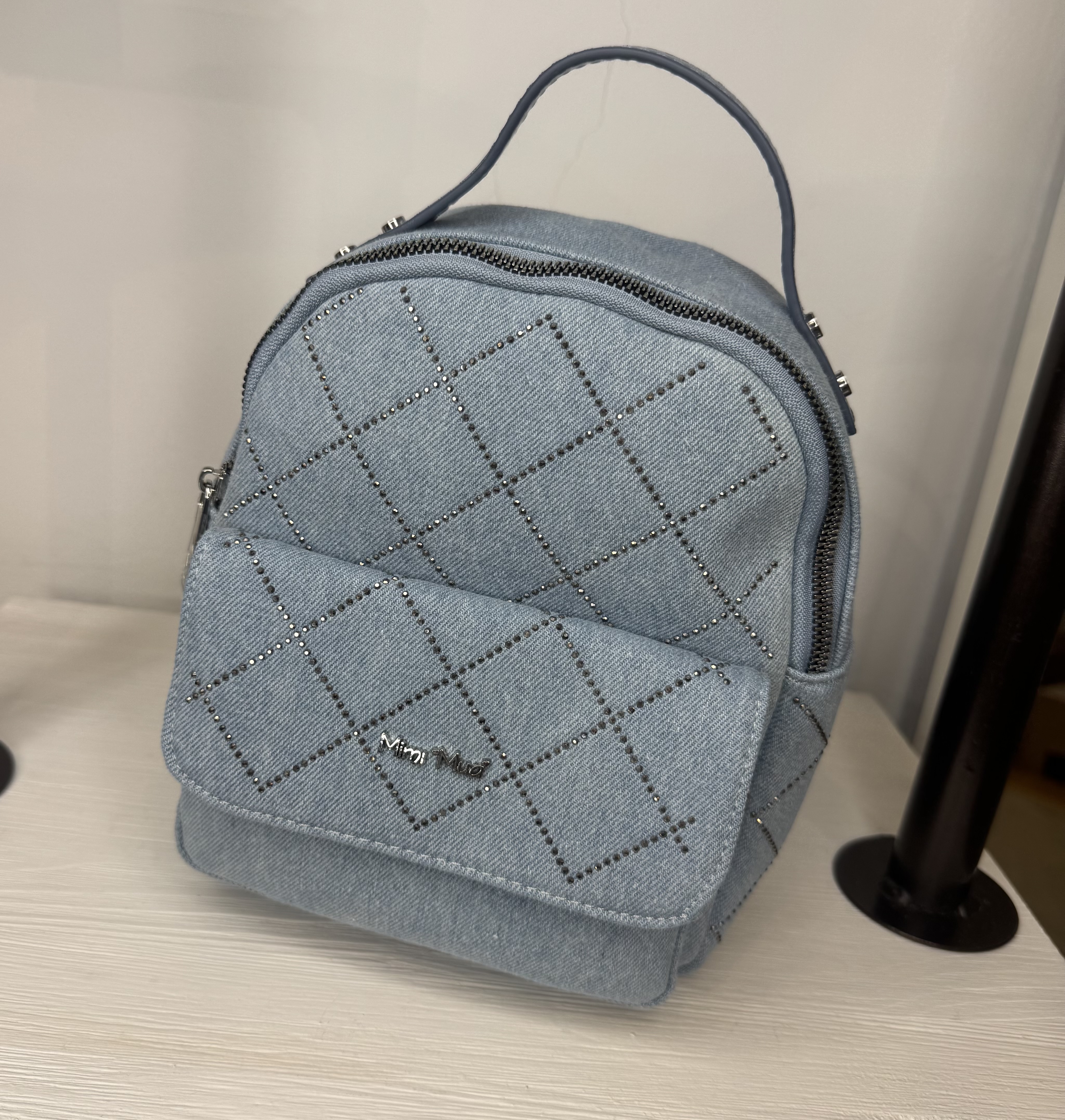 Mochila con un patrón acolchado y pequeños apliques de pedrería. Cuenta con un compartimento principal con cierre de cremallera y un bolsillo frontal con solapa. Incluye correas de hombro ajustables y compactas. Dimensiones aproximadas 10cm de profundidad y 21 cm de alto.