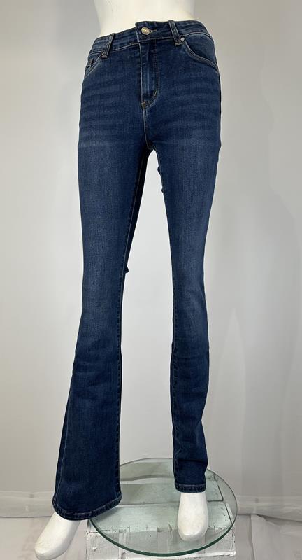Jeans de tejido elástico y cinco bolsillos. Cierre frontal con cremallera y botón.