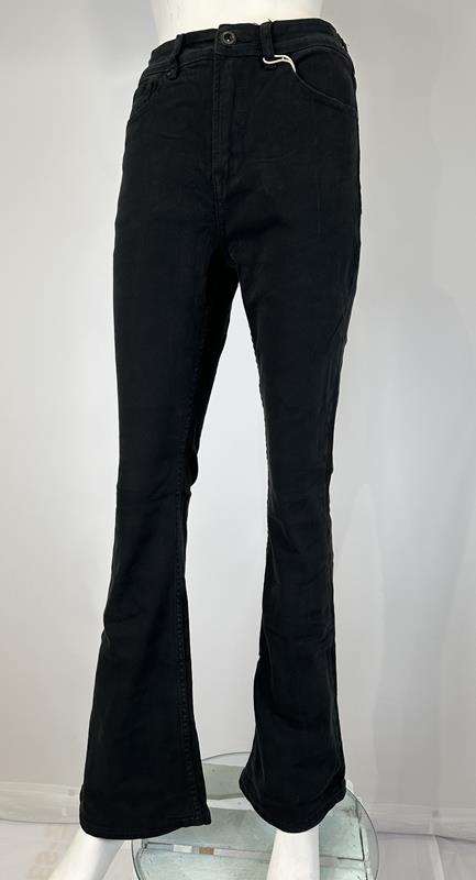 Jeans campana con tejido elástico y cinco bolsillos. Cierre frontal con cremallera y botón.