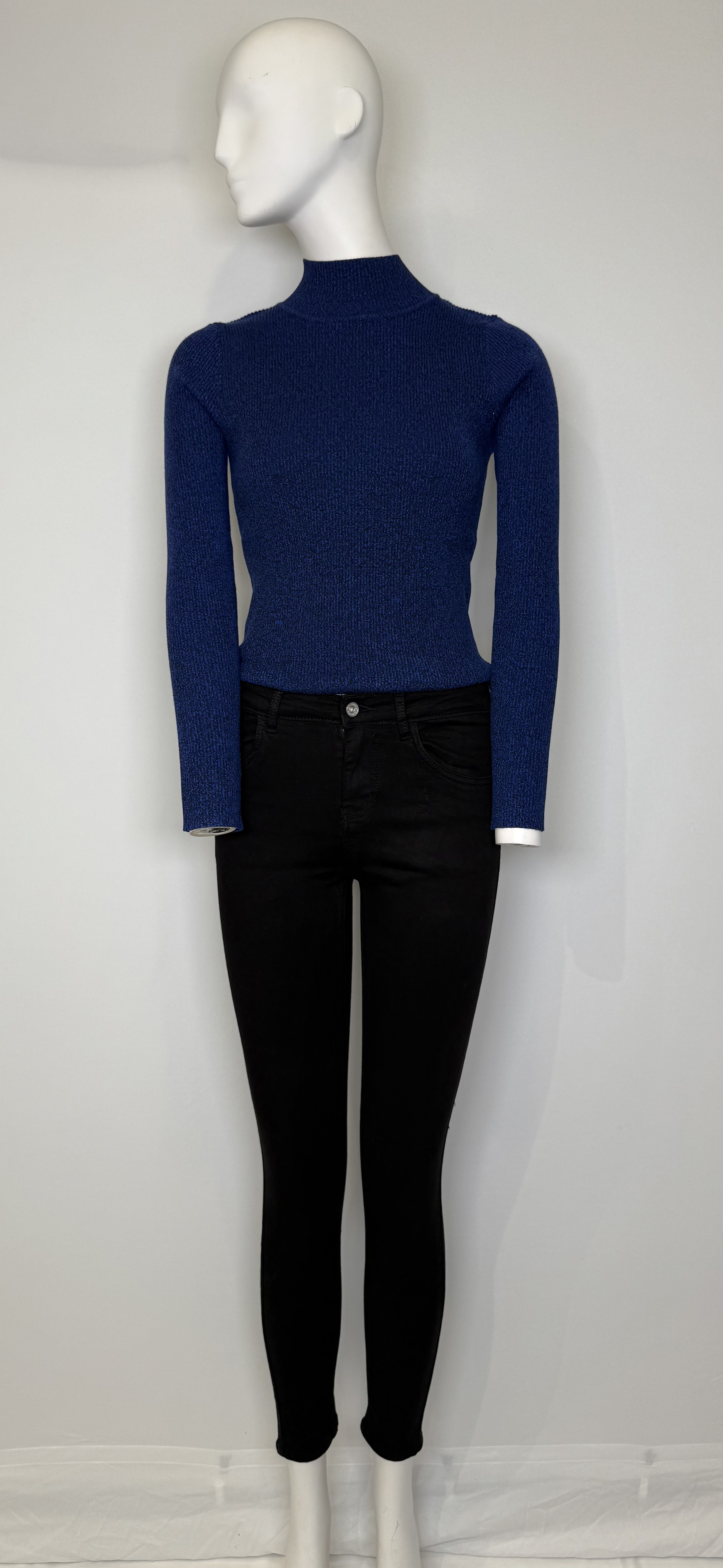 Jeans pitillo de tejido elástico de tiro alto y cinco bolsillos. Cierre frontal con cremallera y botón.